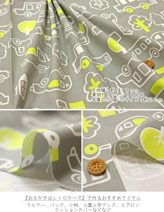『おえかき☆レトロカーズ』コットン100%ナンバー10オックスプリント素材:コットン100% 生地幅:約110cm男の子/キッズ/車/綿/入園/入学/ウェアー/小物/インテリア/ハンドメイド/