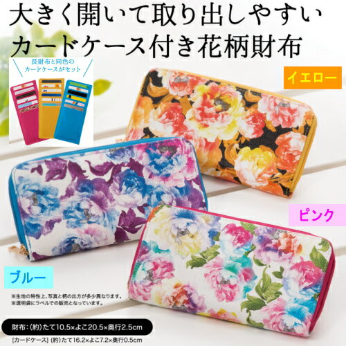 商品名 カードケース付き長財布 (花柄) 商品カラー ・ピンク ・ブルー ・イエロー 商品サイズ 財布:約D2.5×W20.5×H10.5cm カードケース:約D0.5×W7.2×H16.2cm 材質 (財布) 表地:合成皮革 内生地:ポリエステル100% (カードケース) 表地:合成皮革 裏地:ポリエステル100% 使用上のご注意 ●乳幼児の手の届かない場所に保管してください。