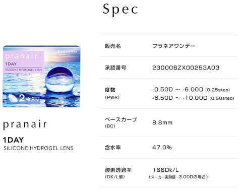 pranair 1day / プラネアワンデー タイプ1日交換タイプ/終日装用 枚数 2枚/1箱 素材 シリコーンハイドロゲル(olifilcon B) BC 8.8mm DIA 14.1mm レンズデザイン 球面デザイン 分類 グループI 含水率 47% Dk値 133(メーカー実測値) Dk/L値166(メーカー実測値-3.00Dの場合) 度数範囲 -0.50〜-6.00(0.25step) -6.50〜-10.00(0.50step) 中心厚 0.08mm(-3.00Dの場合) 紫外線カット率 UV-A 約84%(メーカー実測値-3.00Dの場合) UV-B 約96%(メーカー実測値-3.00Dの場合) 紫外線吸収剤 ベンゾトリアゾール系 着色剤 アントラキノン系着色剤 保存液の主成分 塩化ナトリウム/ホウ酸系緩衝剤 その他配合成分(保存液) ヒアルロン酸ナトリウム、アルギン酸ナトリウム MPCポリマー 承認番号23000BZX00253A03 広告文責株式会社トキワカメラ 電話番号047-361-5225 製造販売株式会社シンシア 区分高度管理医療機器 コンタクトレンズは高度管理医療機器です。